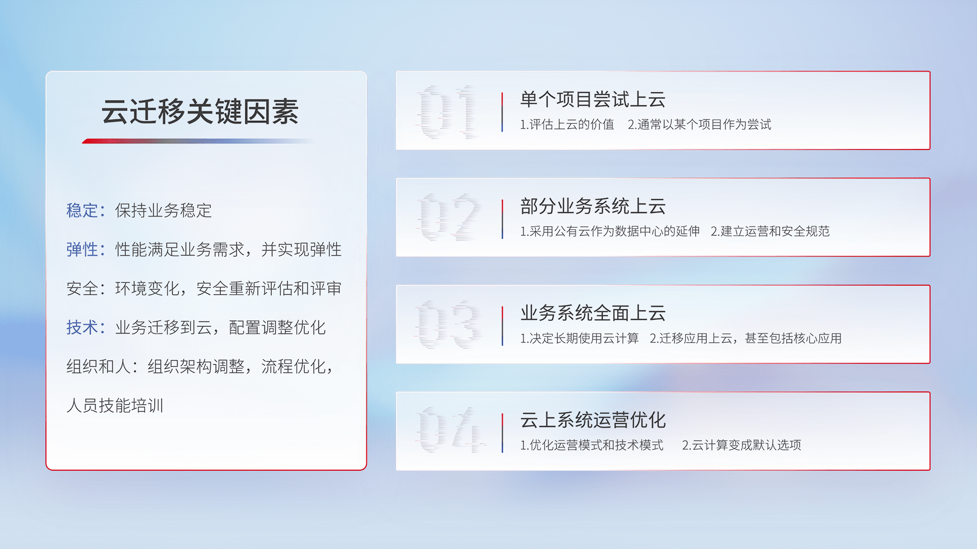结合实际业务,,,,从规划设计、、云平台选型、、、云原生改造、、、数据迁移、、、、集成交付,,,迁移全过程为客户识别最佳上云路径,,,做好风险识别管理,,,设计网络架构、、身份权限、、、安全审计合规、、、、操作审计、、日志审计、、、监控告警策略、、、多站点容灾设计等,,,,对云上基础设施进行整体规划,,提升IT治理水平,,,,以满足弹性、、高可用、、、、高性能的需求。。。