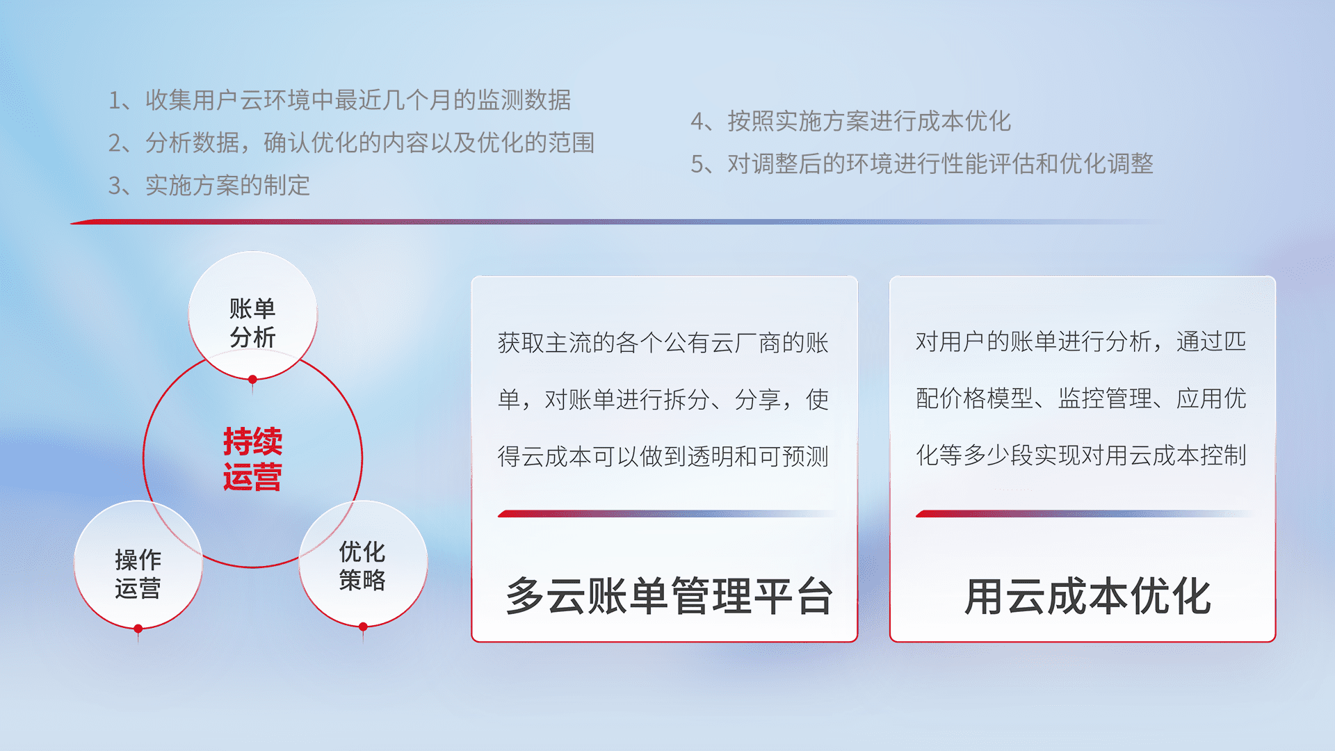 通过多云纳管,,以统一的资源数据模型把客户的云资源进行抽象和封装,,,进而实现对多云资源的统一操作,,保障云资源管理的可靠性、、、稳定性与可用性。。。。量身定制化运维内容,,,配置、、开发运维、、、补丁管理、、备份、、、监控、、、、认证和访问管理、、、、审计和日常巡检等,,保障在用云过程中的可靠度,,,稳定度以及高可用率。。。